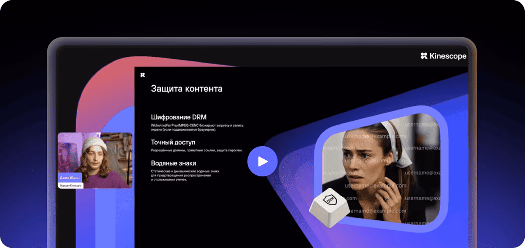 Видеопоток зашифрован: скачать видео через браузер или расширение не получится. Если кто-то всё-таки запишет экран, динамические водяные знаки помогут отследить источник утечки.