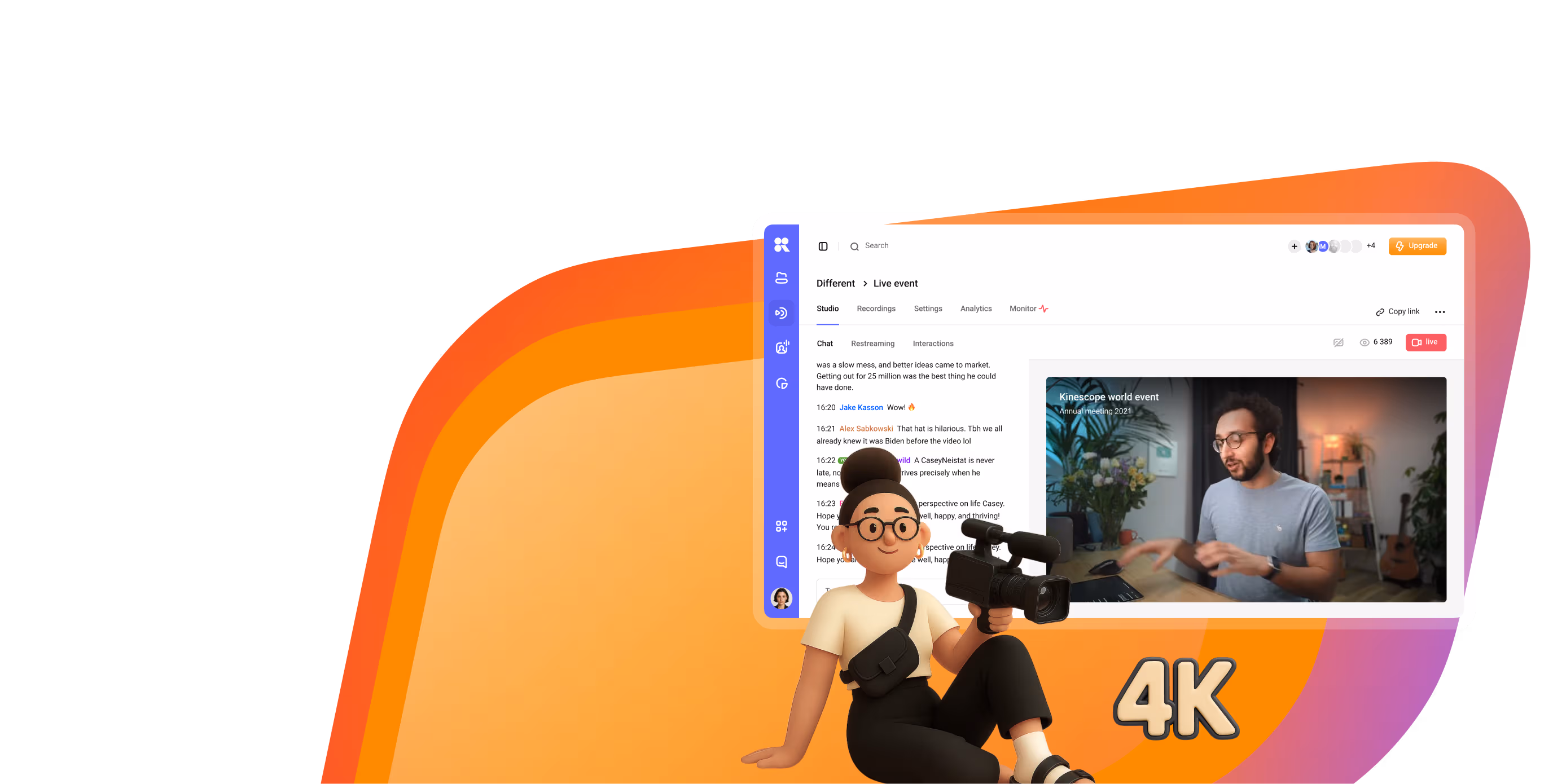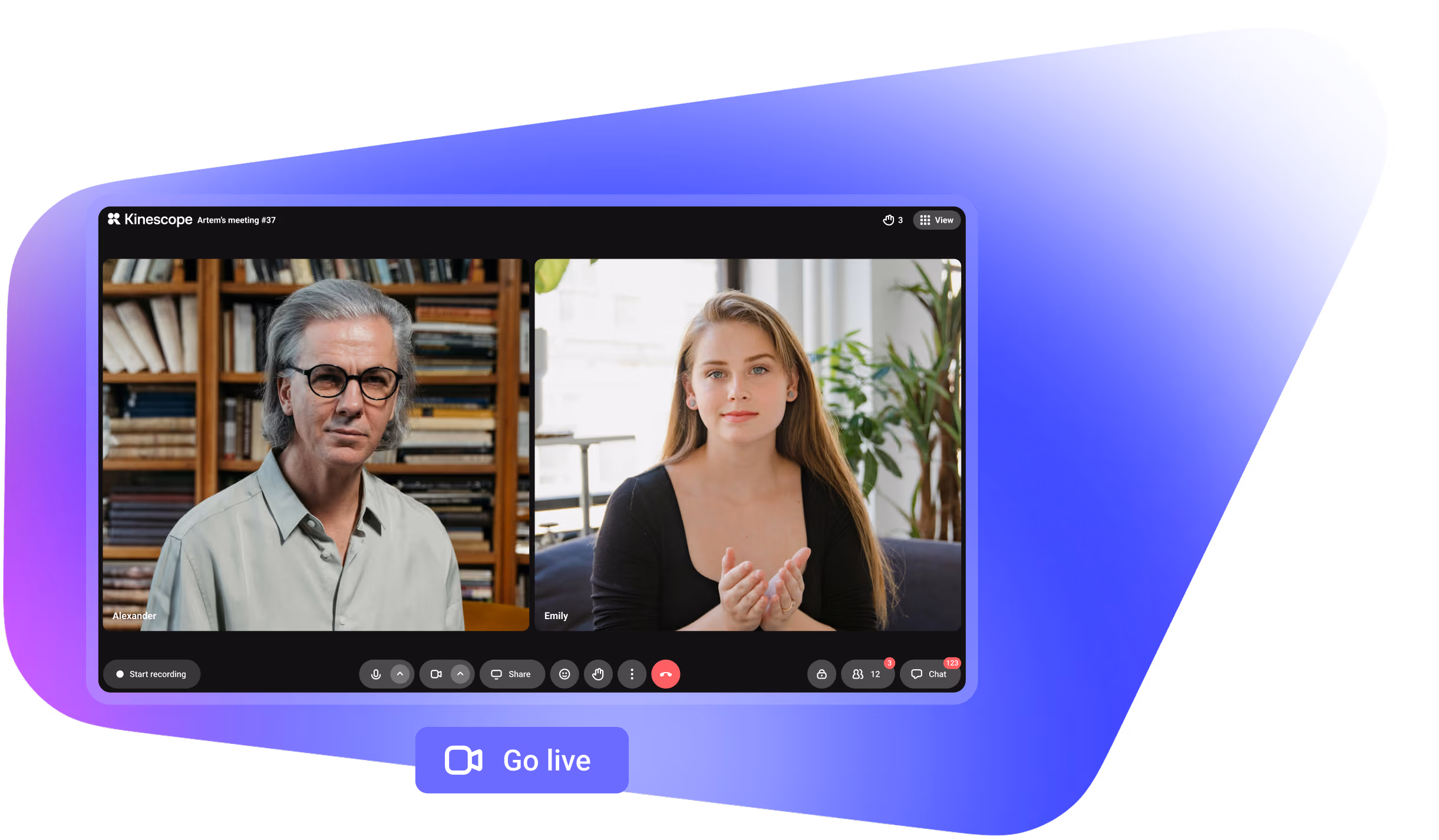 Организовывайте эфиры любой длительности для широкой аудитории: качество до 4K и стабильная работа под нагрузкой с адаптивной отдачей. Рестримьте одновременно на внешние платформы (YouTube, VK, Twitch — до 10 площадок) из одного окна. Настраивайте приватность: пароль, ограничения по доменам или IP. Запись встречи сохраняется в каталог автоматически.